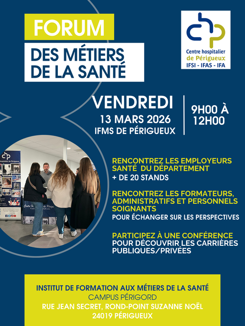 Le Centre Hospitalier de Périgueux participera au Forum des métiers de la santé, organisé à l'Institut de Formation des Métiers de la Santé (IFMS) du Centre Hospitalier de Périgueux.