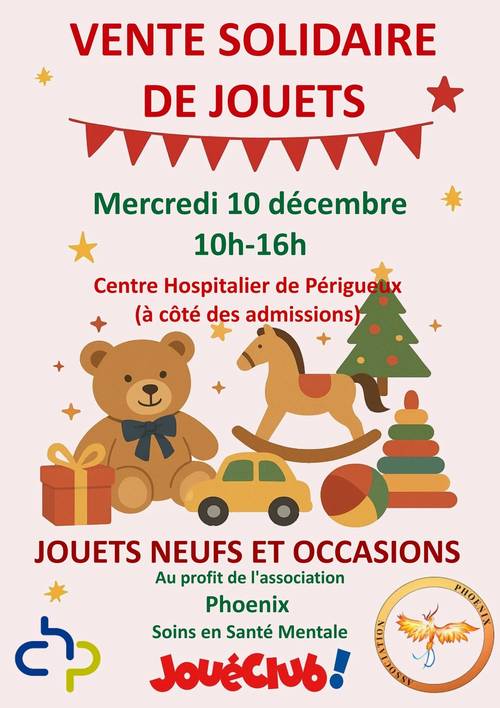 L'association Phoenix, du service de Psychiatrie adulte SAR/HDS du Centre Hospitalier de Périgueux, organise une vente solidaire de jouets neufs et d'occasion dans le hall du CHP, le mardi 10 décembre, de 10h à 16h.